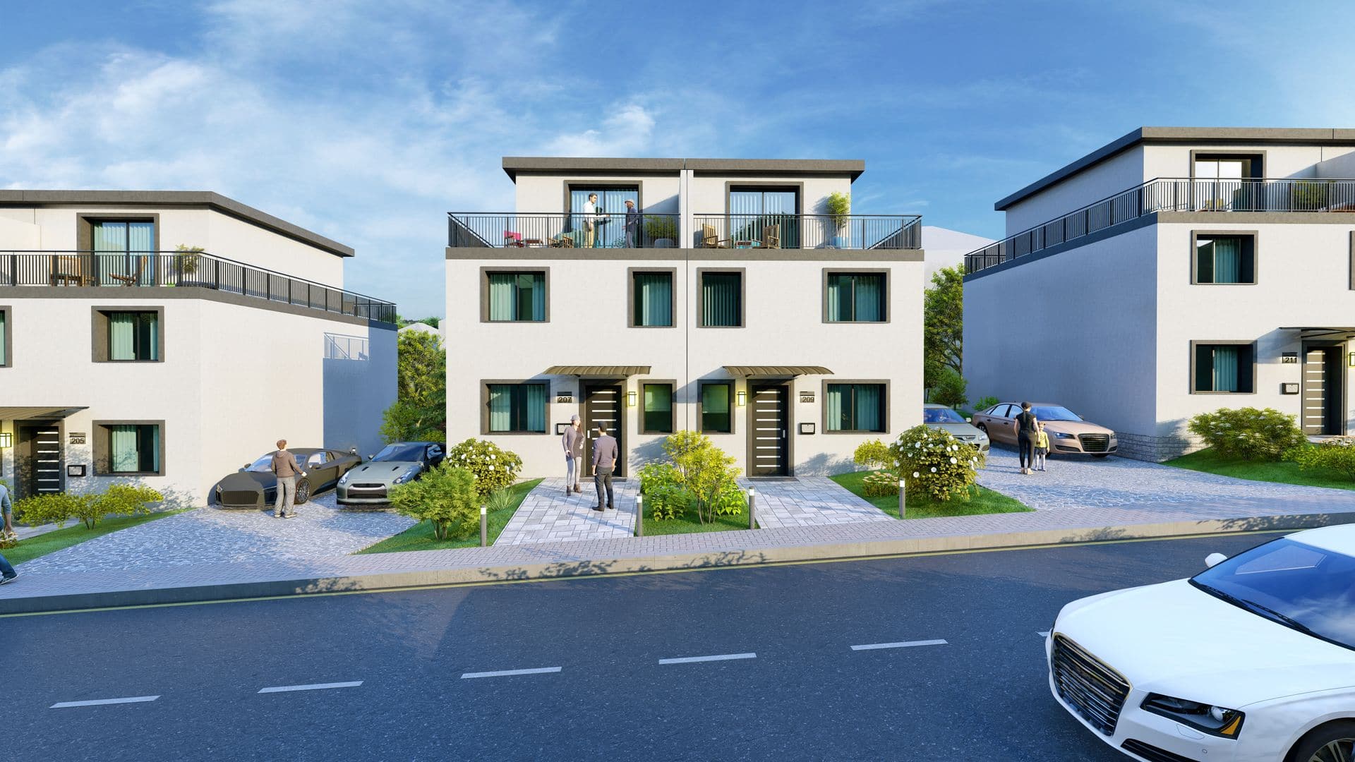 Auf knapp 1.717m² groĂźen GrundstĂĽck werden vier individuelle, moderne Doppelhaushälften – real geteilt – mit Garagen und Stellplätzen errichtet. Die Fertigstellung ist fĂĽr das Jahr 2021 geplant.Â
